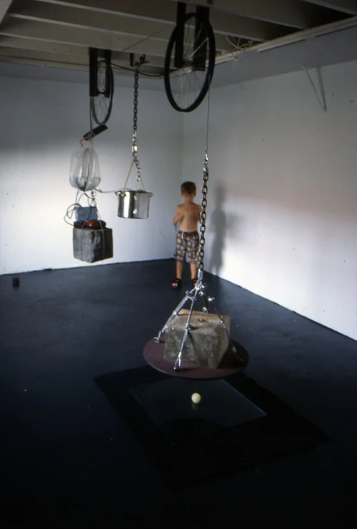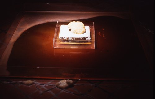Discarded cemetery flowers, 9 mm spent bullet shells, rubberized mesh, gauze, basin, plastic, bed frame, inflatable mattress